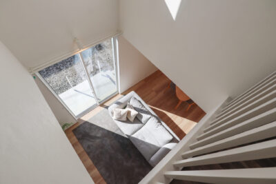リビングの吹き抜けが光を取り込み、実寸よりも広く感じる開放感。 子どもの動きが把握しやすく、安心できる家族時間が増えます。