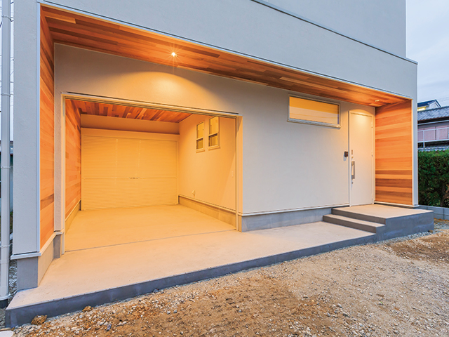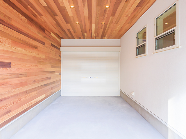 木目の内壁が美しいビルトインガレージ。室内から愛車を眺められる小窓が設けられ、機能性とデザイン性を兼ね備えている。