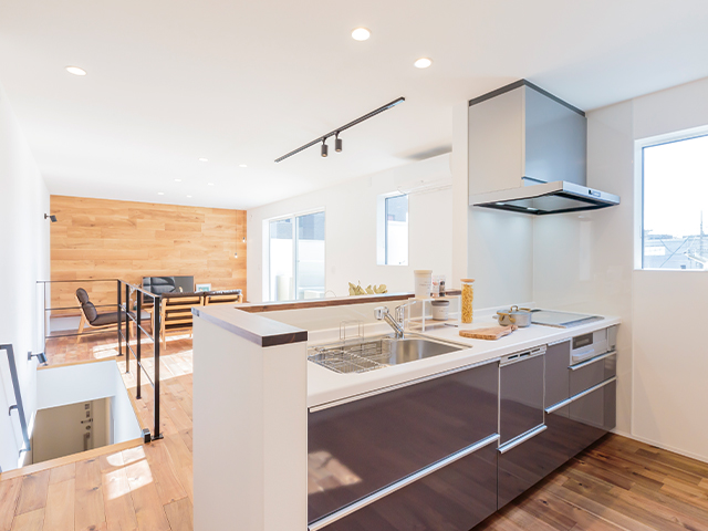 キッチンからリビング全体を見渡せる設計により、家事をしながらでも家族の様子を感じられる。