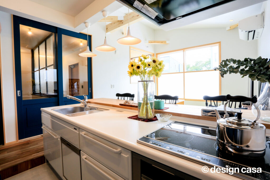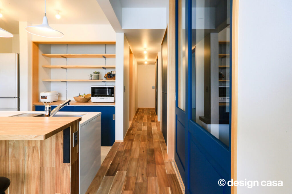 木とブルーのバランスが美しいキッチン。暮らしに溶け込む収納と生活動線が、毎日の家事を心地よい時間に変えてくれる。