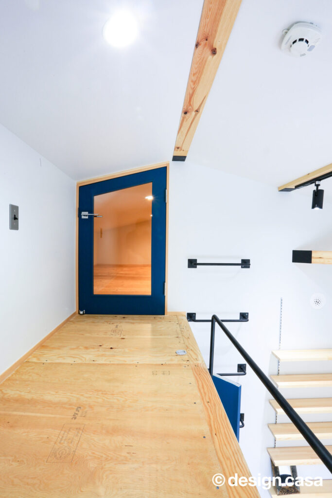 屋根裏へとつながる青い扉。隠れ家のようなロフトスペースは、子どもも大人も心躍る特別な空間に。