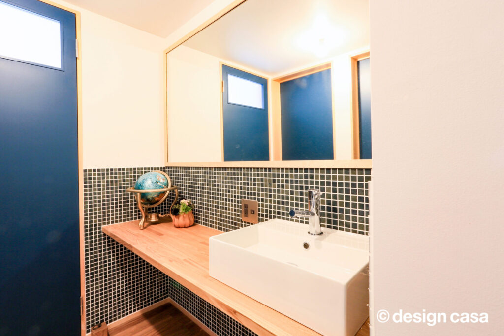 木の天板とモザイクタイルが目を引く洗面台。朝の準備が少し楽しくなるような、静かで整った場所。