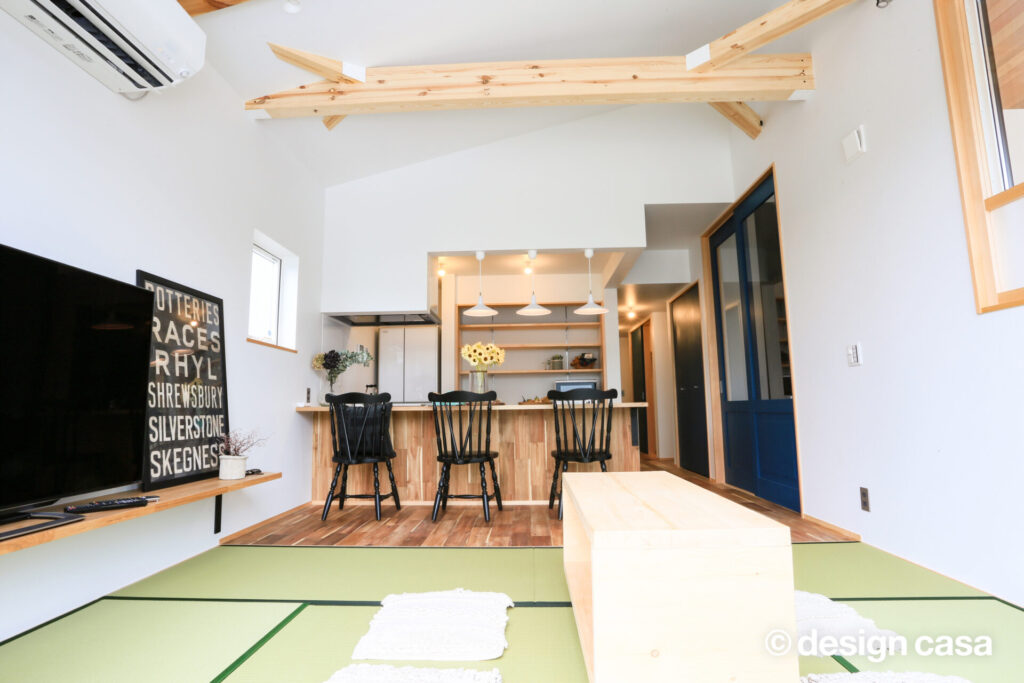 畳のぬくもりと木の質感が心を包むリビング。ゆったりとした時間が流れ、自然と家族が集まる居場所になる。