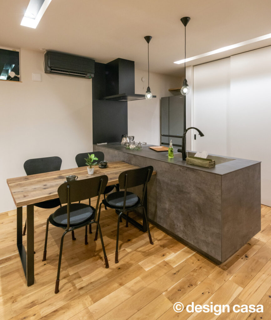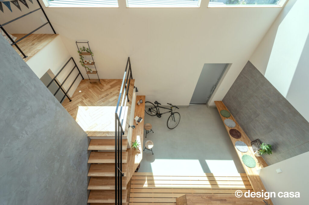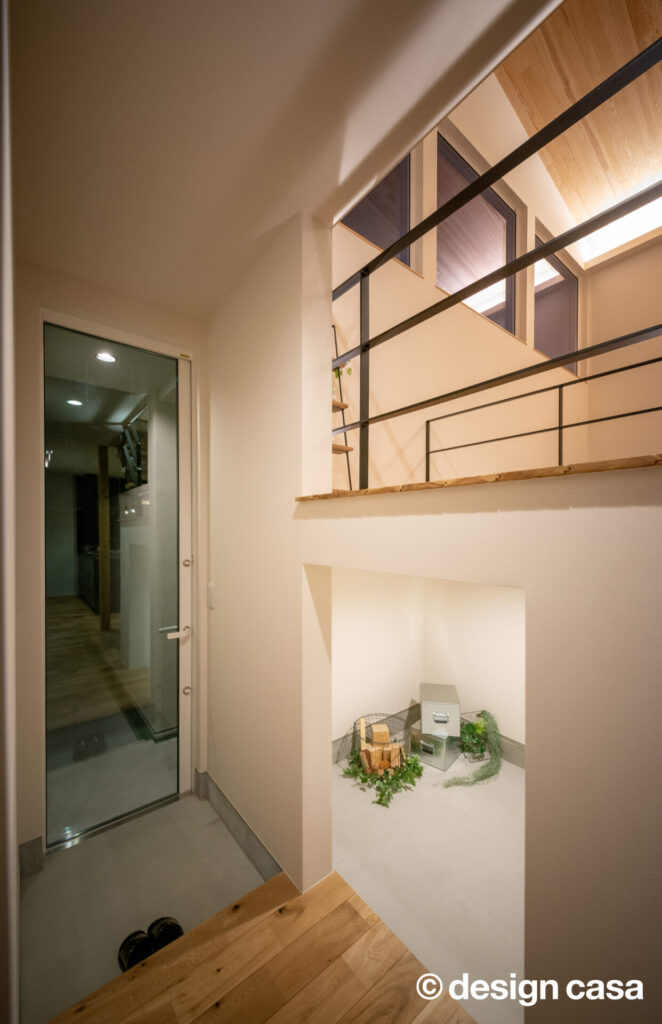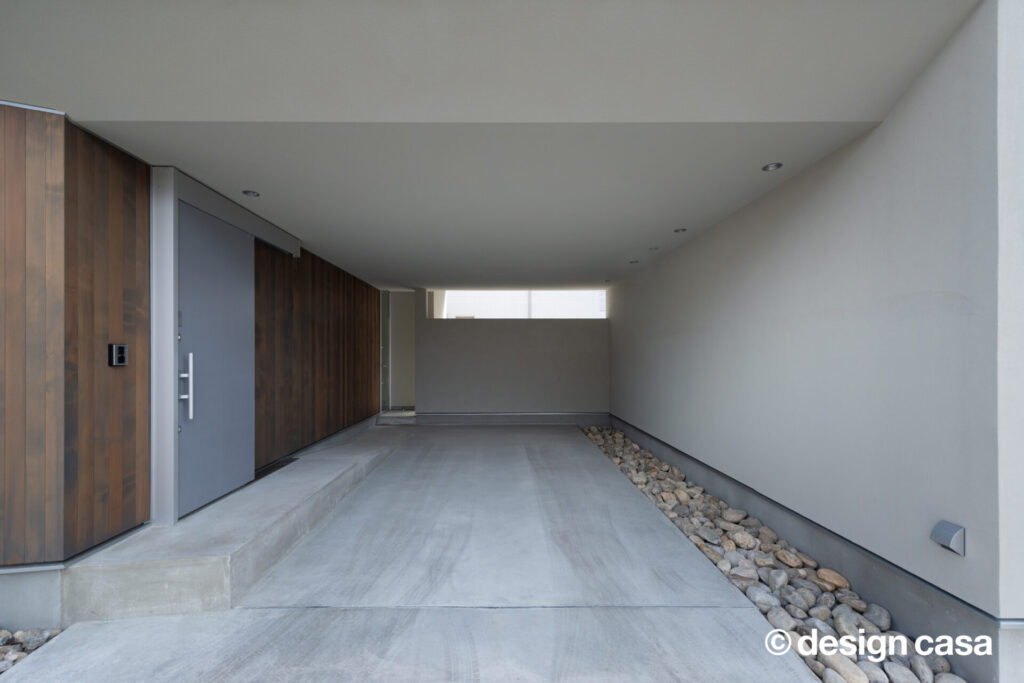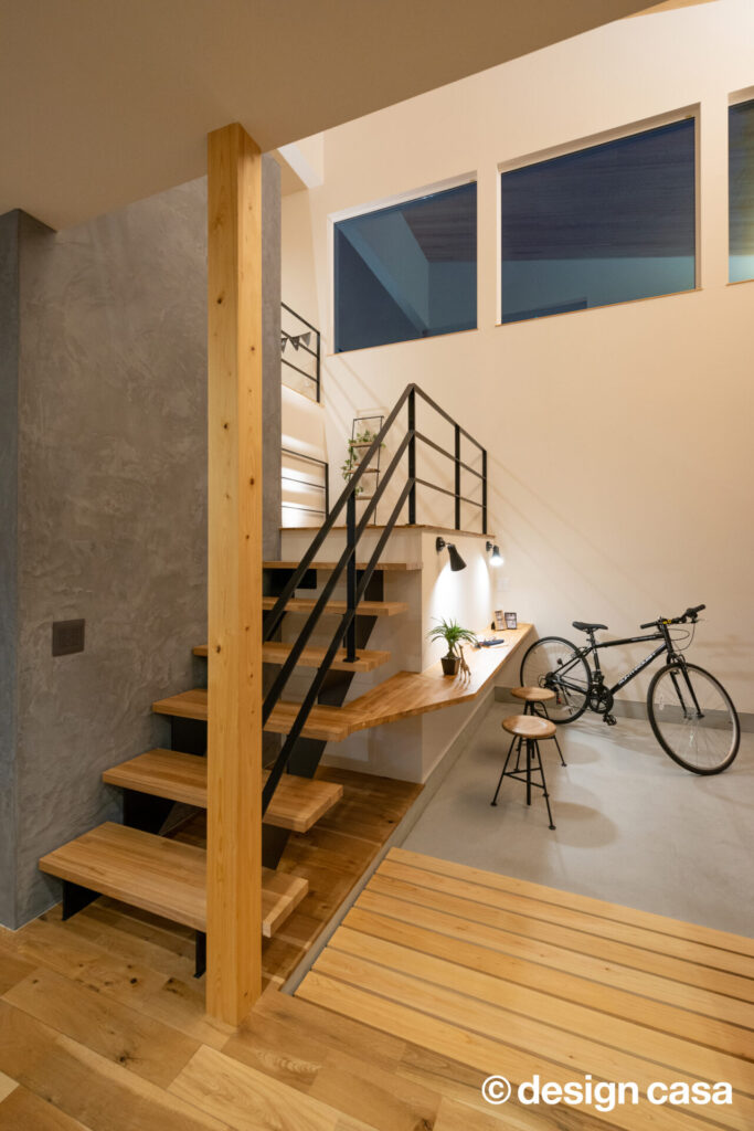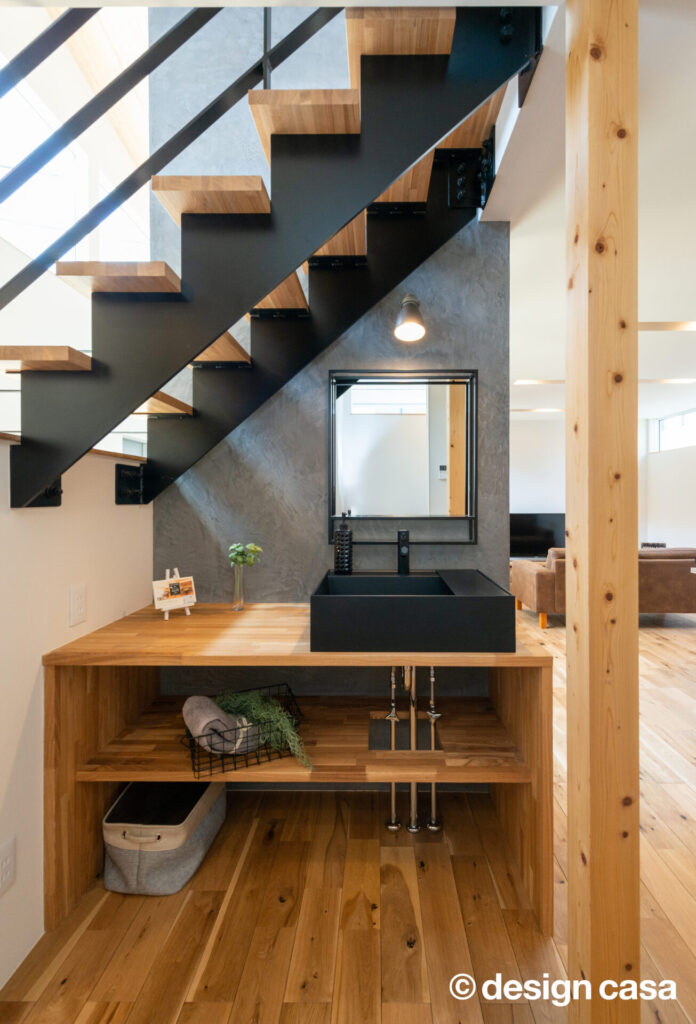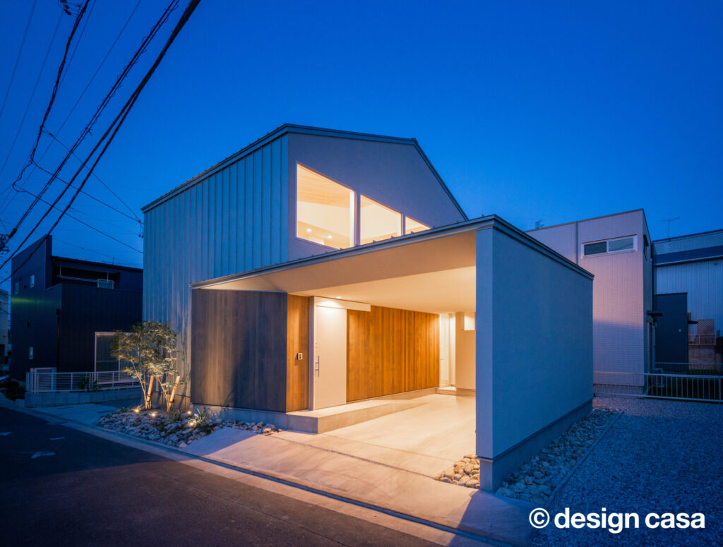 静けさを纏うファサード 凛と佇む、上質な日常 木の温もりと陰影が美しく溶け合うファサード。夜の静けさの中に、やさしく灯る光が心を和ませる。 雨風をやさしく遮りながらも、開放感を忘れない。シンプルな線と質感が、日常の動線を上質に整える。 光と影が際立てるミニマル構造 無骨さと木の温もりが融合した洗面空間。無駄のない造作棚が暮らしにちょうどいい余白を与える。 高窓から降り注ぐ光が、土間と階段を柔らかく照らす。開放感と静けさが心地よく混じり合う玄関ホール。 夜の灯りが階段とワークスペースをやさしく包む。まるでカフェのような心地よさが広がる。 グレーのキッチンと無垢床が描く、シックなリビングダイニング。素朴と洗練が同居する心地よい空間。 材の美しさを引き出したダイニング。自然体で過ごす時間が、何気ない日常を少しだけ特別にする。 視線の抜けと光の回りが絶妙な階段まわり。吹き抜けの立体感が、暮らしに奥行きを添えている。 一覧へ 前へ