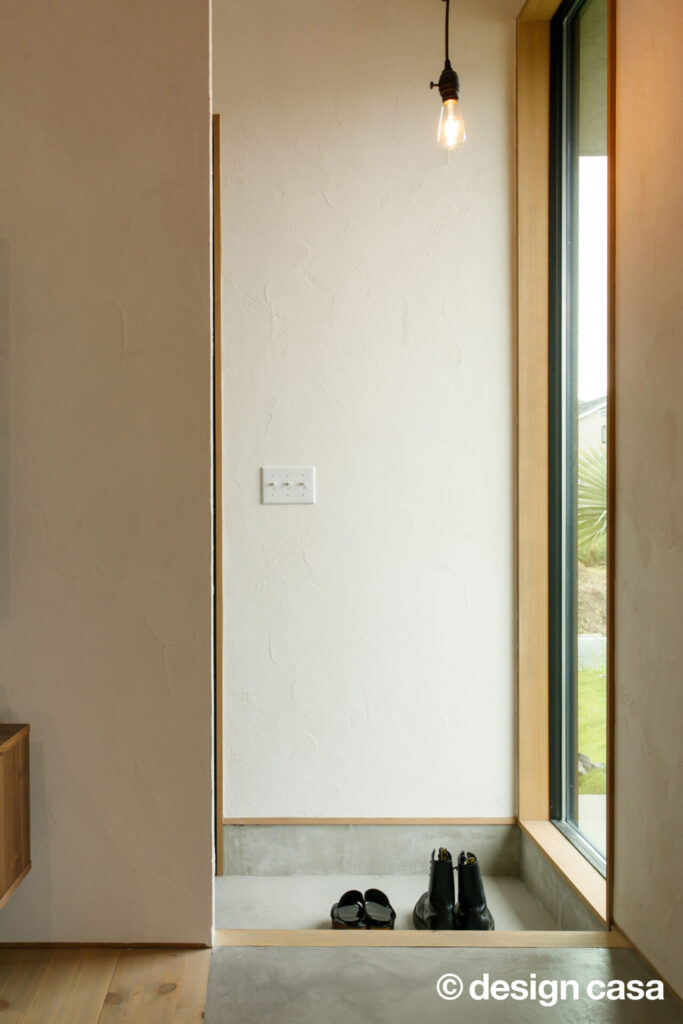 無駄を削ぎ落としたシンプルな玄関。自然光が差し込み、日常の始まりと終わりにやさしい余白を与えてくれる。