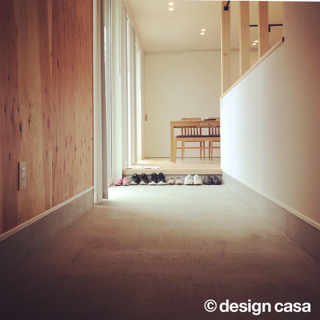 木の温もりに包まれる土間のある玄関。家族や仲間を迎えるやさしい空気が、この家の豊かさを物語る。