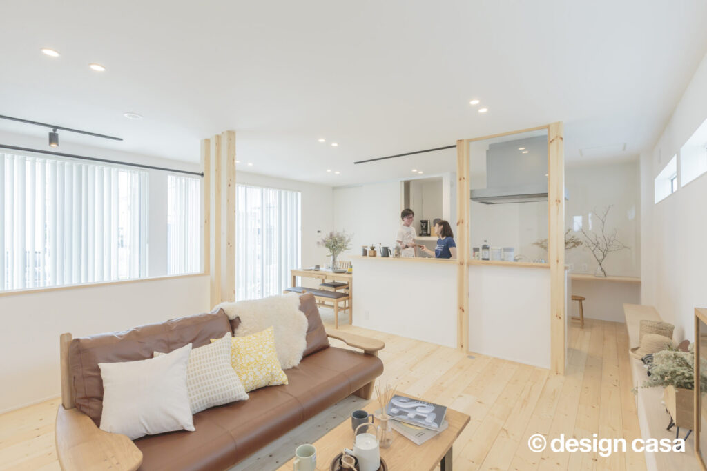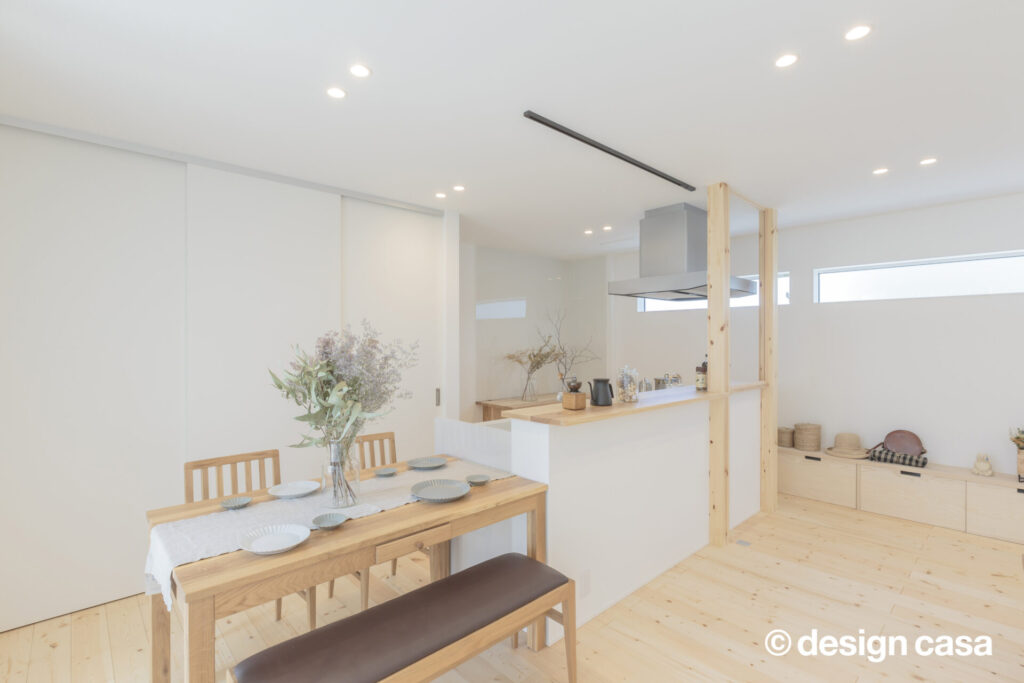 暮らしの中心に置かれた食卓とキッチン。やさしい光と自然素材に囲まれた日々が、家族の時間を育てていく。
