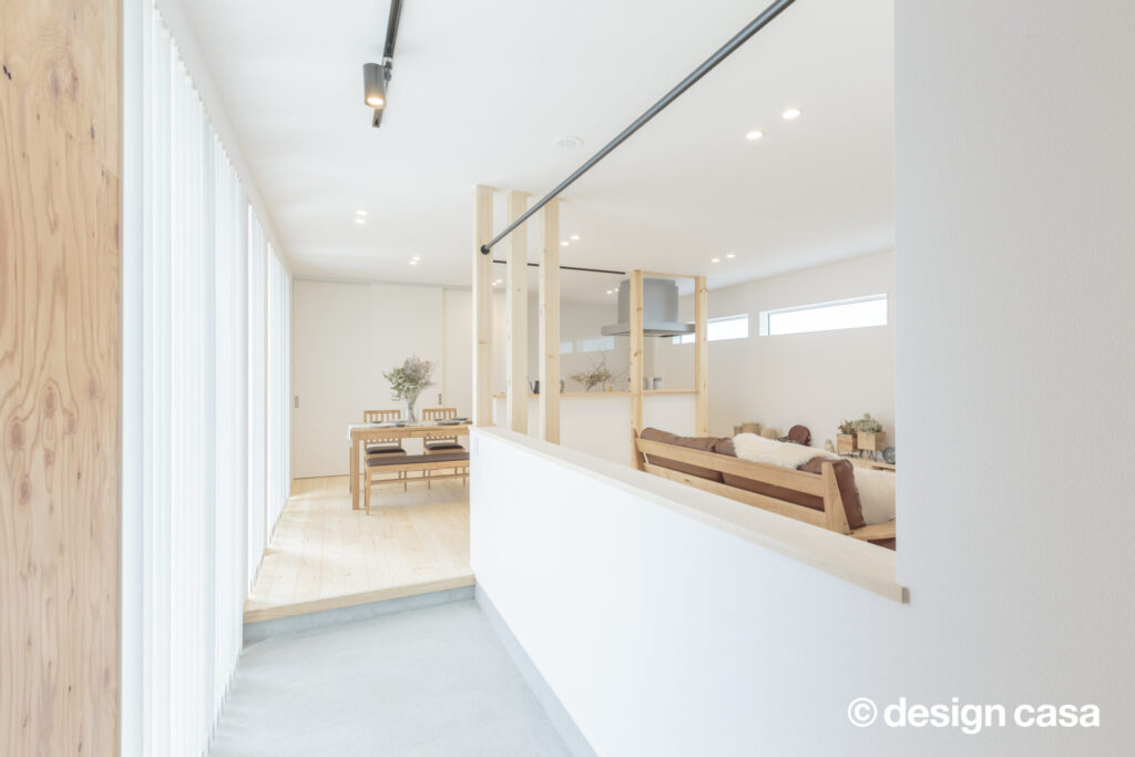 光と木が連なる土間の先に、ゆるやかに広がるLDK。空間のつながりが、心の距離まで近づけてくれる。