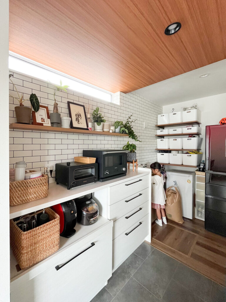 あとは腰壁。キッチンの奥が見えにくくなっているので。子育てしているとどうしても物が増えてしまうので、見えないようにできて良かったです。